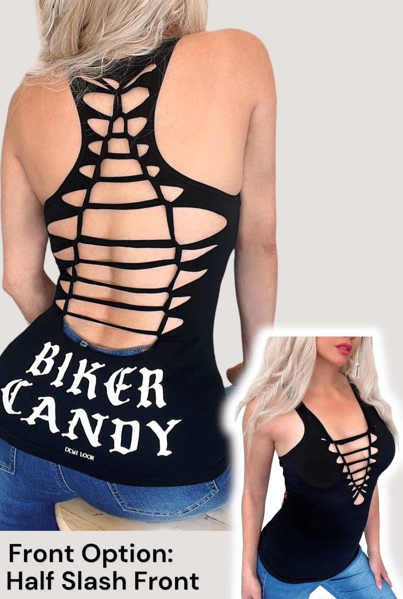 Biker Candy Graphic Back Racerback Sexy Slashed Biker Festival Tank
