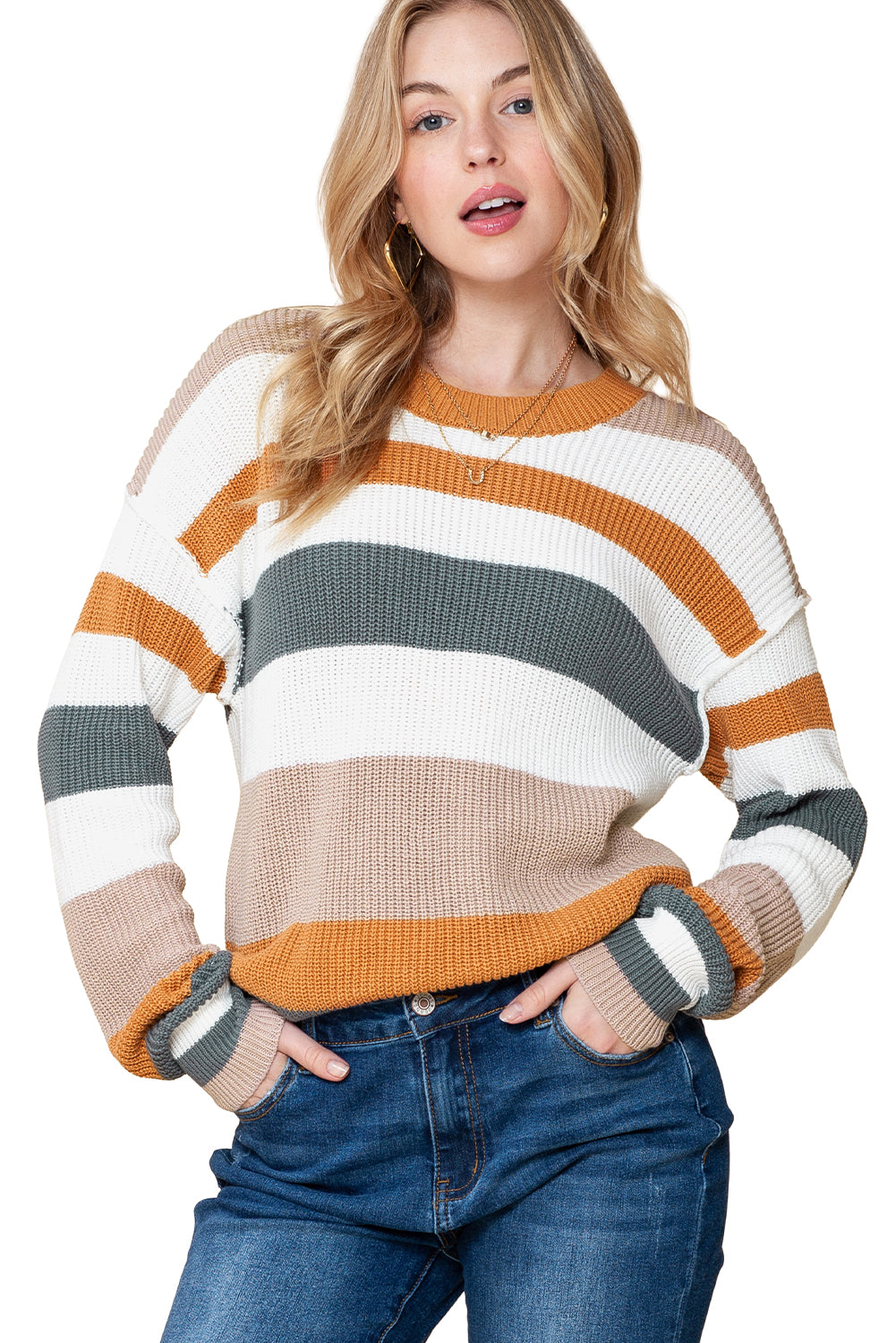 Camel Ribbed Round Neck Color Block Knitted Sweater