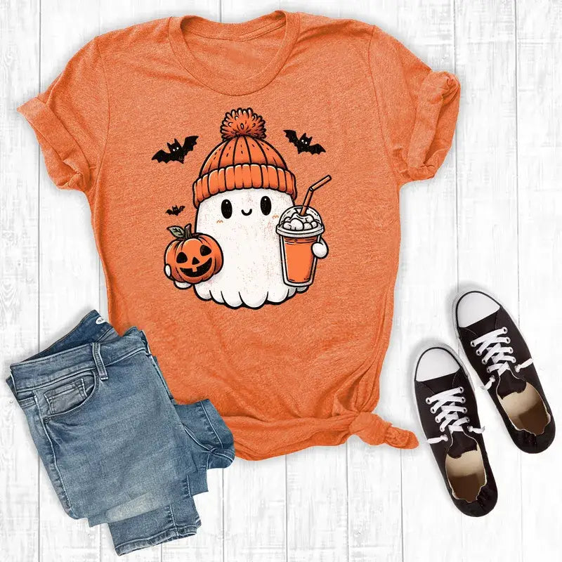 Halloween Ghost With Coffee Graphic Tshirts Orange