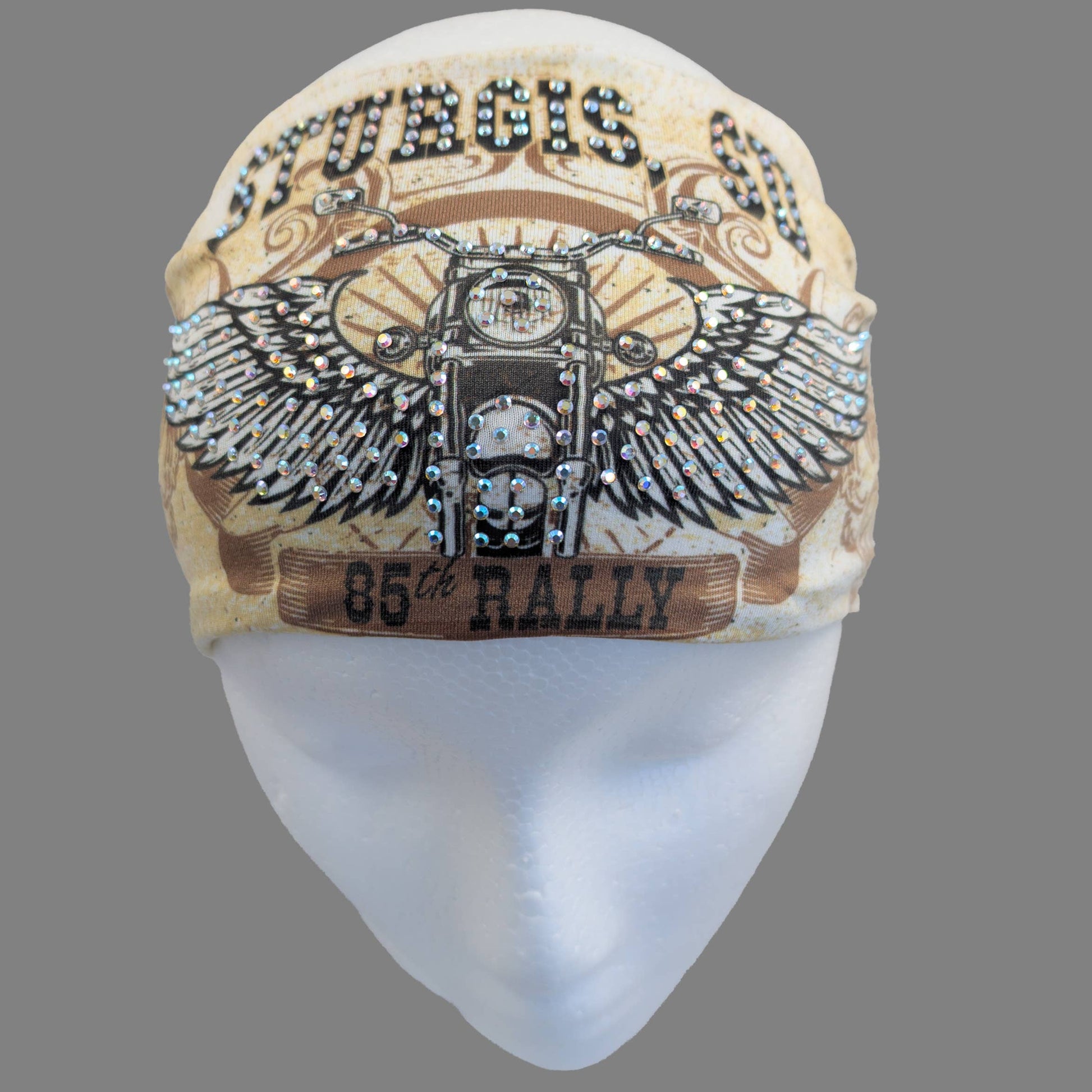 Sturgis 85th sublimation bike and scrolls graphic on distressed tan headwrap with rhinestones. Cooling fabric, wicks sweat from wearer. MADE IN USA Headwrap has flat back for comfortable fit under hat or helmet