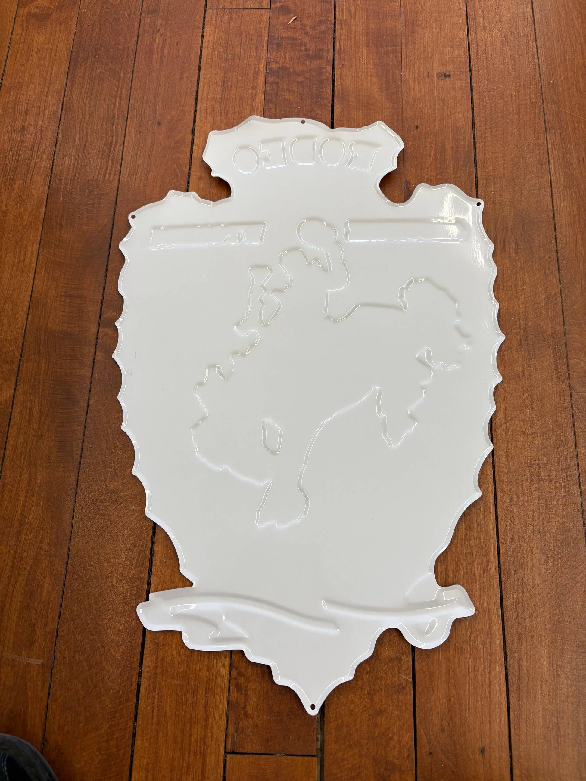 17 .5" x 11.5” scalloped edge, embossed metal wall sign, Rodeo Bronc Rider on a die-cut arrowhead. Rodeo Just Another Day At The Office !! Great for a man cave or home décor. Made in the USA