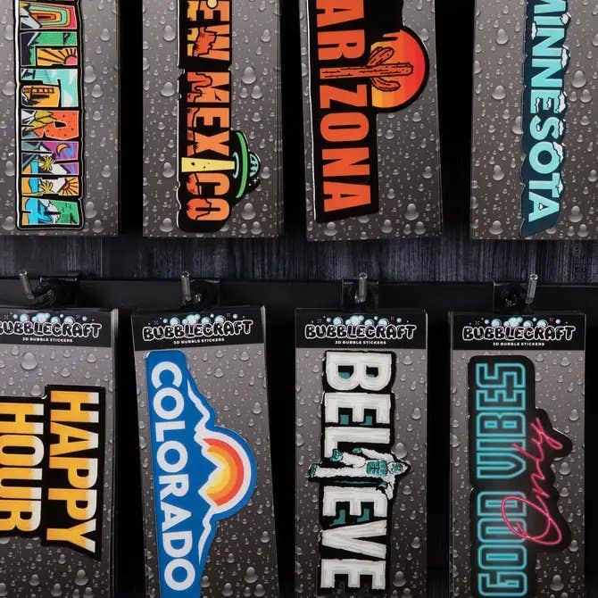 -Expoxy resin poured over paper sticker to create a three dimensional product that maintains its vibrance and quality much longer than traditional paper stickers