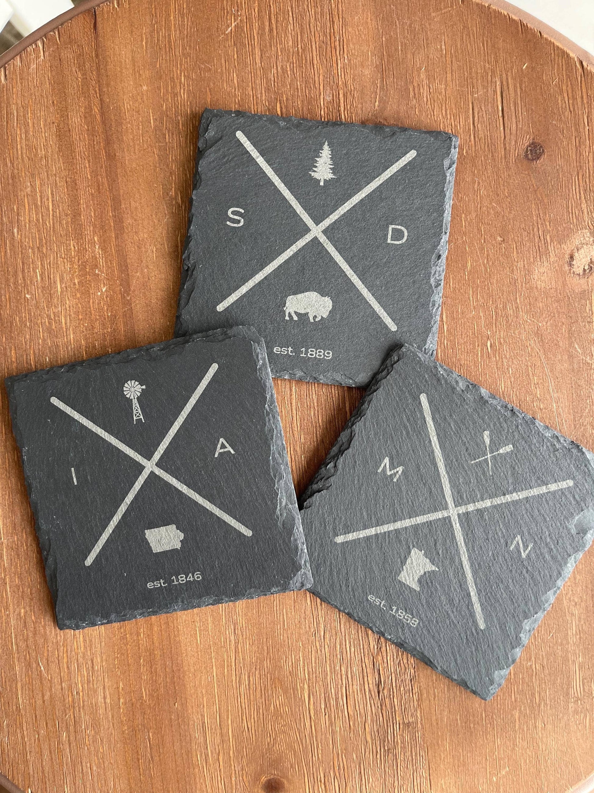 Add a touch of South Dakota's rugged beauty to your home with these laser-engraved slate coasters. Each coaster features a unique design that showcases iconic symbols of the state, including a majestic pine tree and a mighty bison. Crafted from high-quality slate, these coasters offer both durability and elegance, making them perfect for protecting your surfaces while celebrating the natural heritage of South Dakota.